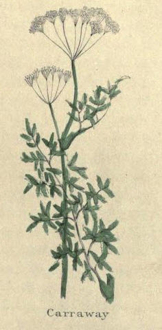 Caraway Description:Carum Carui. The Caraway is propagated chiefly for the seeds. It bears divers stalks of fine cut leaves a little like the leaves of carrots, from among which rise a square stalk, at whose joints are set leaves a little like those of the carrot, but smaller, and at the top small umbels of white flowers, which turn into small blackish seed, which are well known. The root is whitish, small and long, like a parsnip, but with more wrinkled bark, and much less. It is usually sown in gardens. It flowers in July and seeds quickly after.Herbal Remedies and Medicinal Uses of Caraway:Caraway is a good remedy for expelling wind, and for colic. The young root is better food than parsnips; it is comfortable to the stomach, and promotes digestion. The powder of the seed made into a poultice, takes away black and blue spots produced by blows and bruises. The herb itself, or with some of the seed bruised, laid hot in a bag or double cloth to the lower part of the belly, removes wind and colic. Combined with senna, these seeds correct its griping effects. The oil of Caraway, given in six or eight drops on a lump of sugar, is good for pains of the stomach, heart-burn, etcetera.